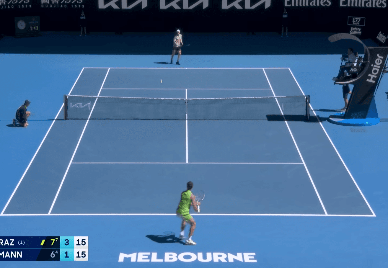 From this position, almost every player in the world is finished. Hanfmann has to guess: he makes a slight move to his left and Alcaraz’s forehand is past him before anyone has a chance to blink.