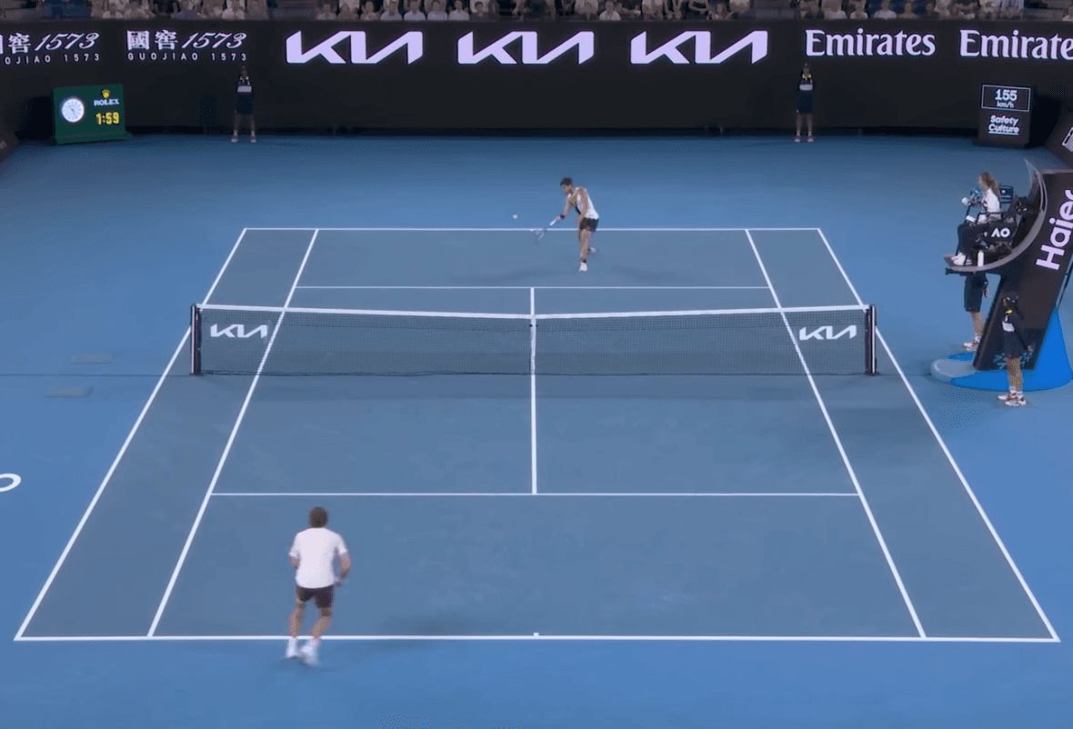 He hits a floaty backhand with Alcaraz able to volley above the net despite being around the service line. Then the lack of front foot intent seems to affect de Minaur – instead of attacking the ball, he backpedals, giving Alcaraz the chance to close the net and hit a good finishing volley. That’s a harsh critique of de Minaur – he’s the sixth best player in the world – but against Alcaraz, almost everyone looks a world apart.