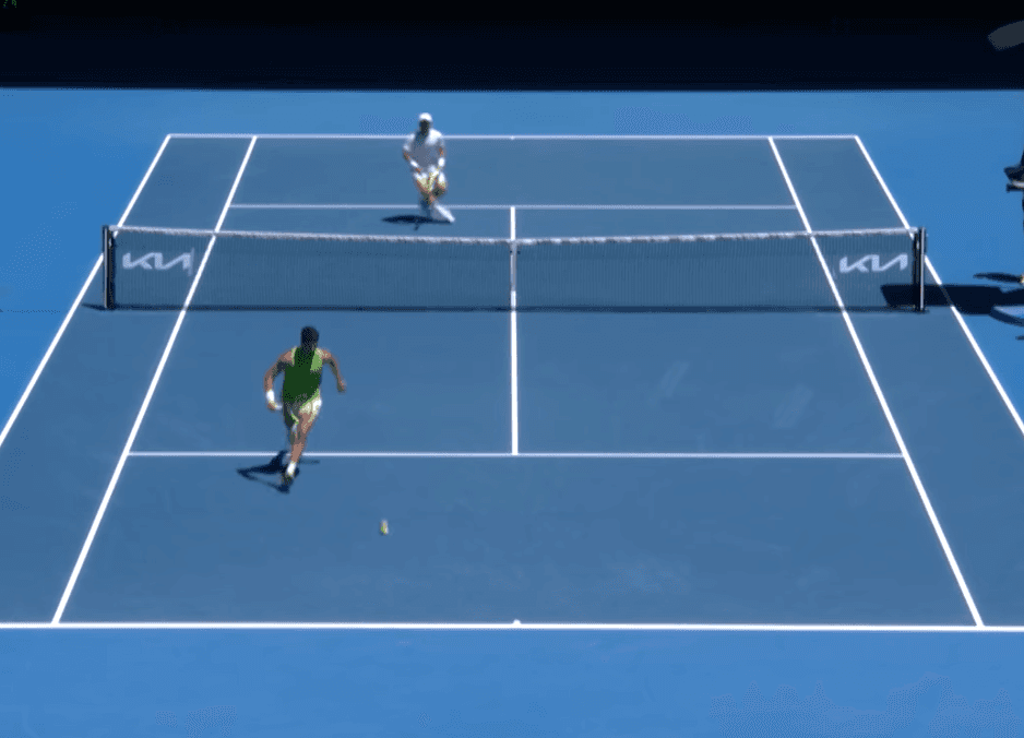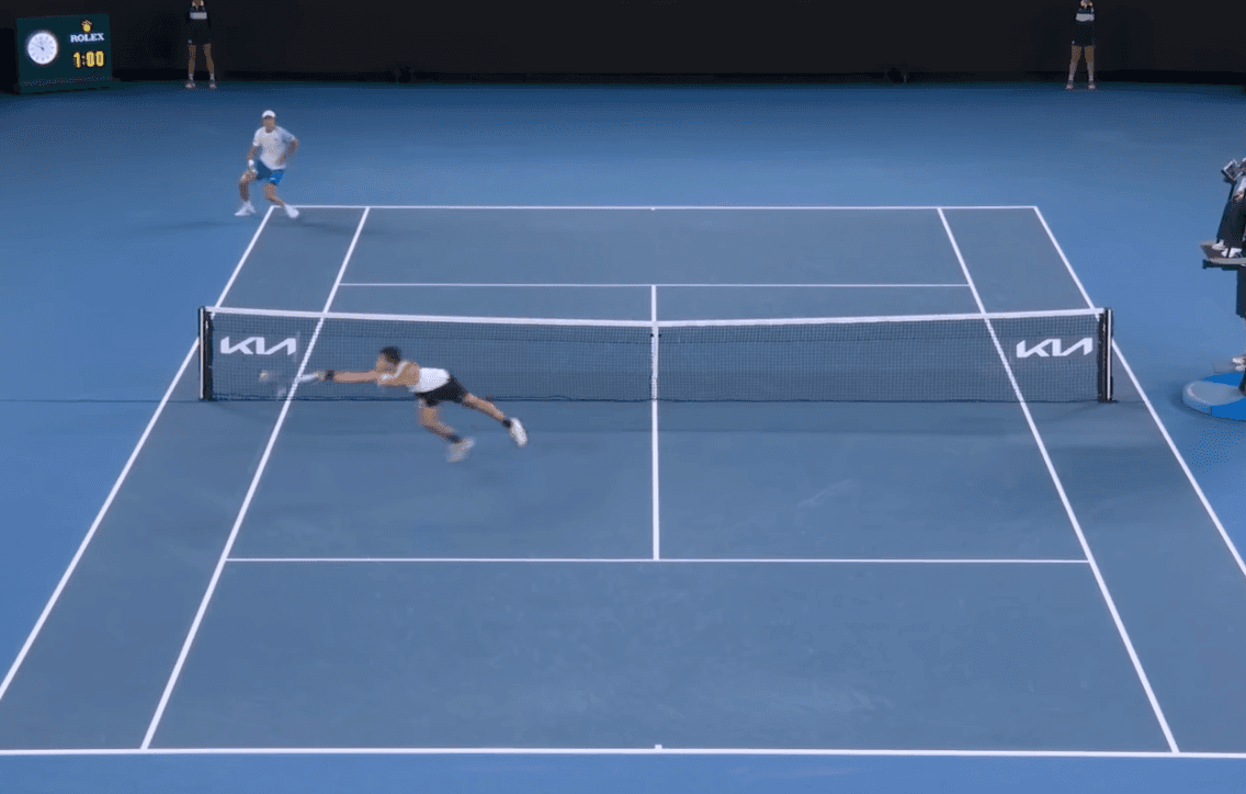 Alcaraz times the half-volley brilliantly and despite Walton hitting a passing shot a good five feet to his left, Alcaraz somehow maintains his balance to hit an unplayable drop volley winner.