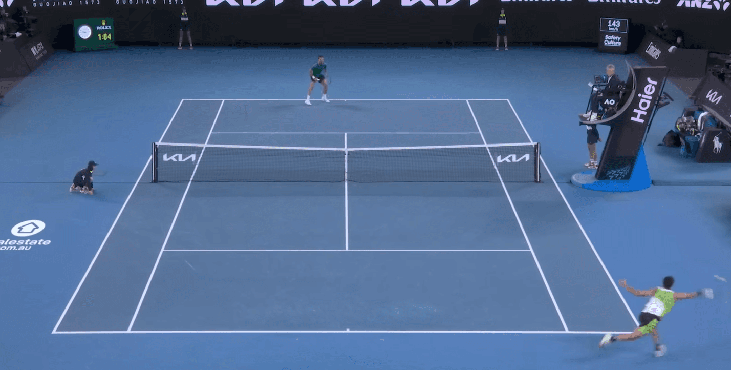 (1:52) In the final, Djokovic hits an excellent wide serve from the deuce court. Alcaraz has to stretch way outside the doubles line to make the return.