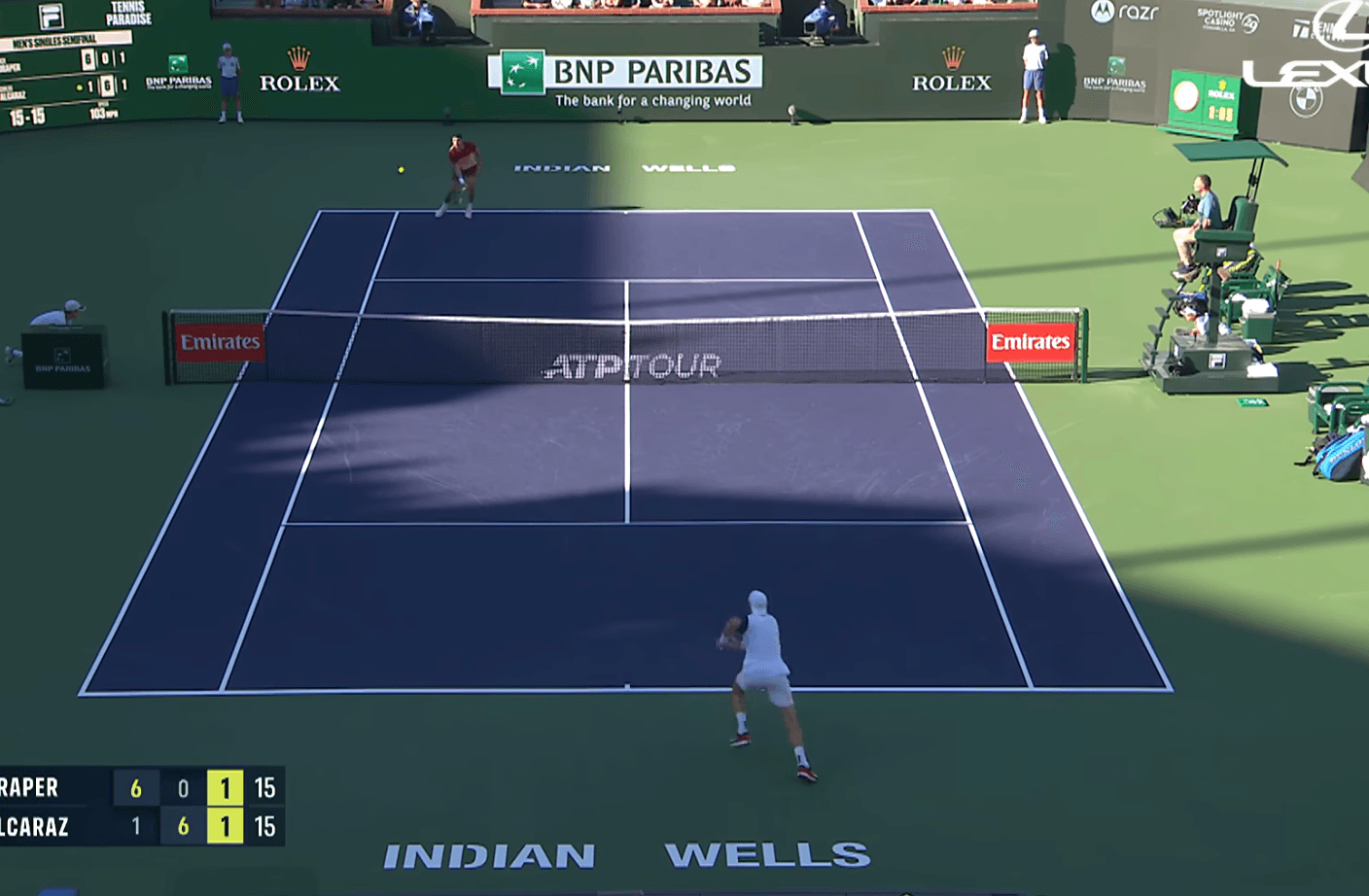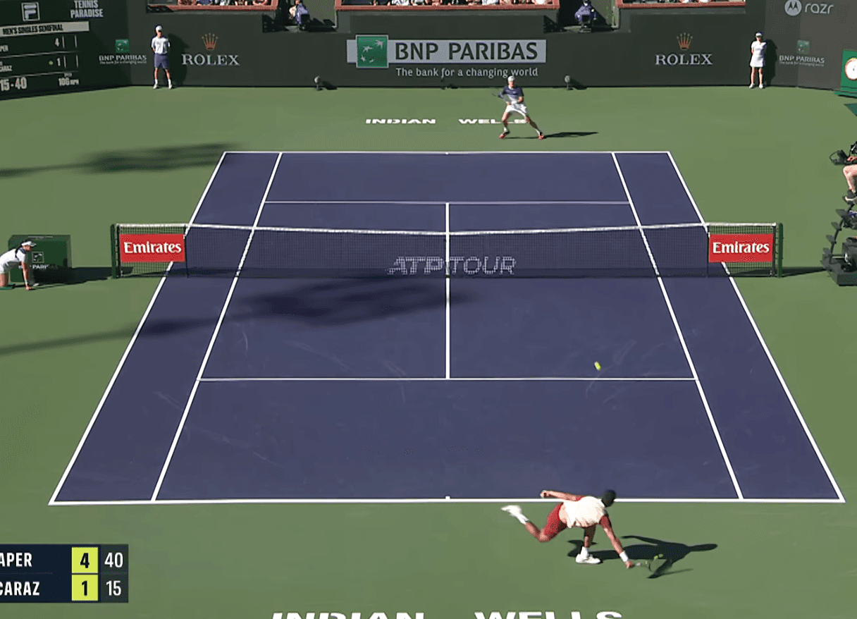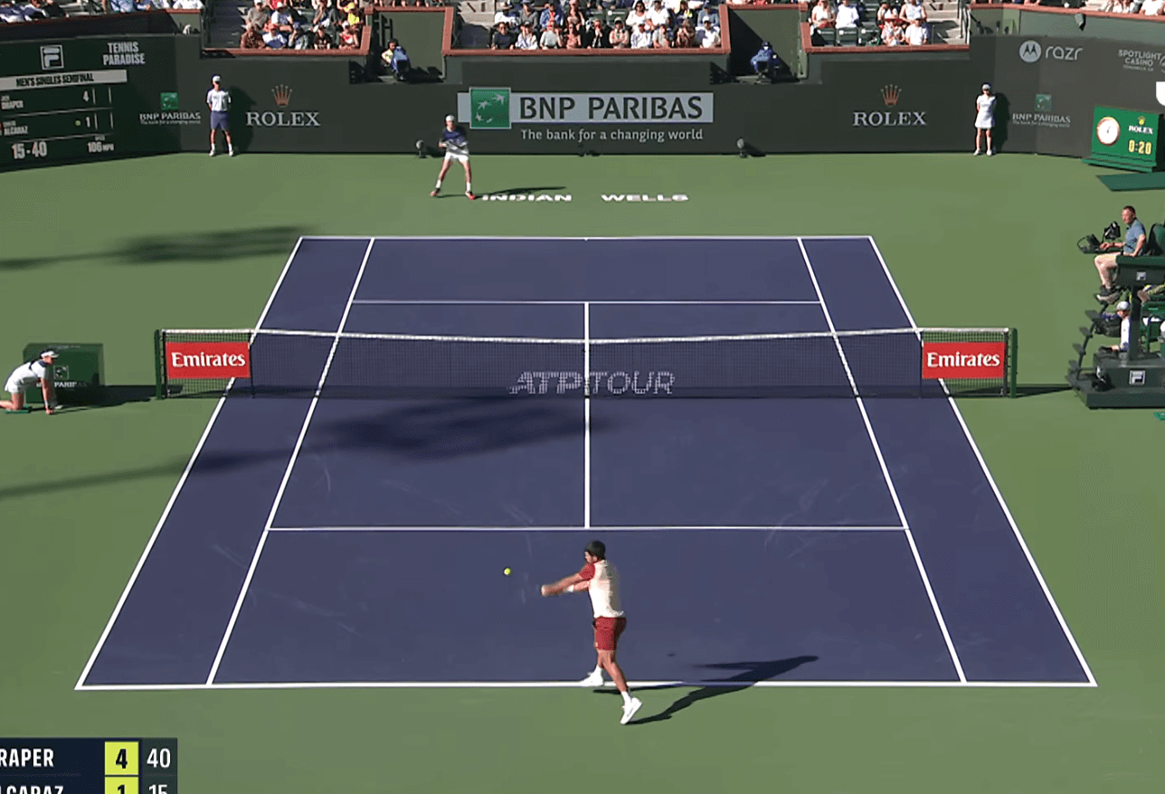 But in the third set (2:25), Draper showed a huge range of skills. At 1-1, 15-15, he stayed in an extended rally even when Alcaraz had him on the defence and back near the “Indian Wells” sign. Alcaraz soon saw the chance to play one of his trademark drop shots.