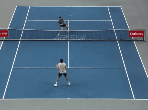 When serving to stay in the match at 4-5, 15-30, Shelton made a particularly loose error on a central forehand to give Fritz two match points. Shelton saved them both, the second with a beautiful wrong-footing inside-out backhand. But the next point, he went for too much and missed a forehand into the net. 40-40 in potentially the last game of the match: the sort of time de Minaur would play the percentages even more. But again he saved a match point, and again by attacking.
